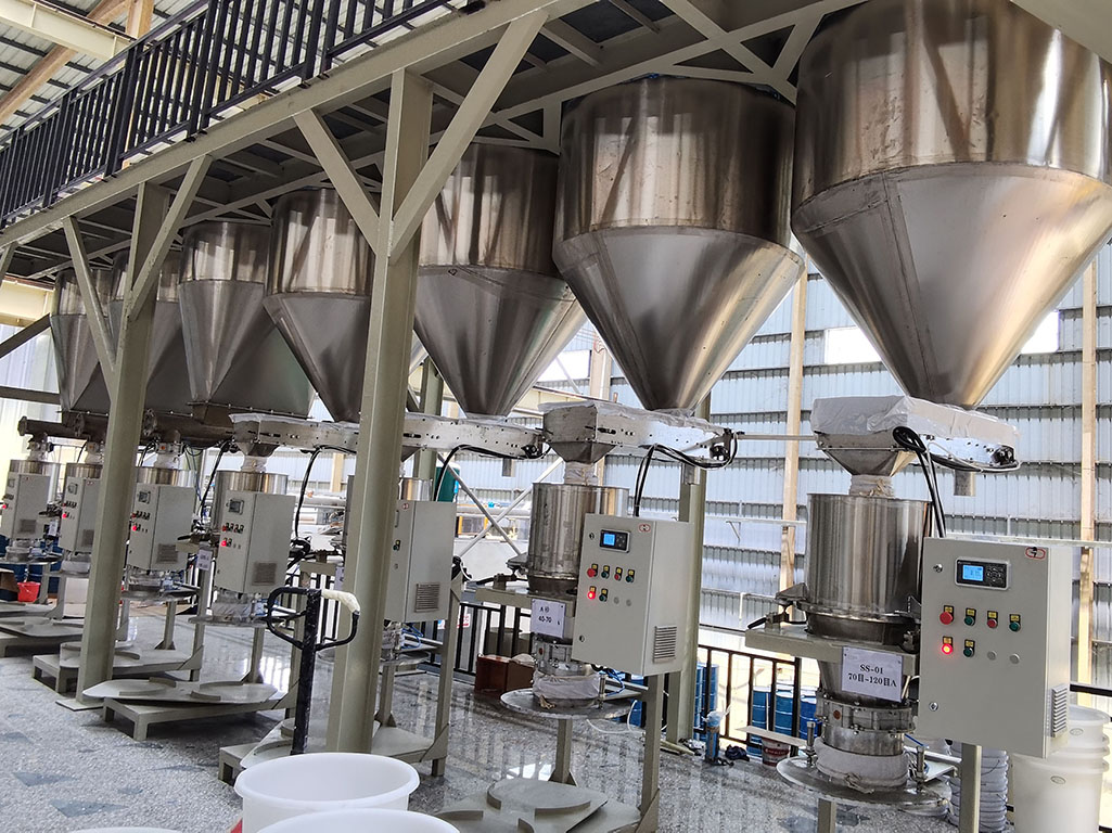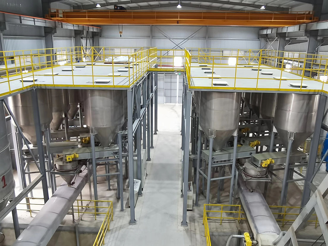 Raw materials are unloaded into the tanks and stored separately according to particle size and type. Level sensors monitor material volume in real time, while sealed structures prevent dust leakage and moisture absorption. When production begins, the tanks discharge materials automatically through controlled gates, feeding the weighing system with stable flow and accurate proportions.