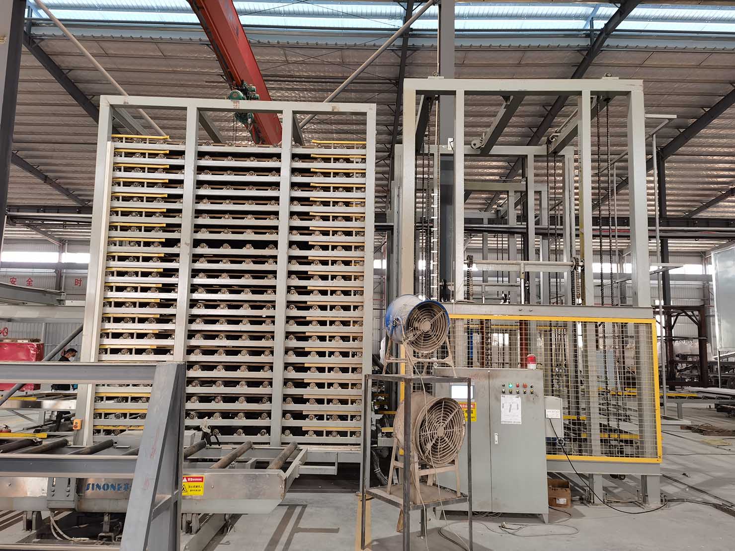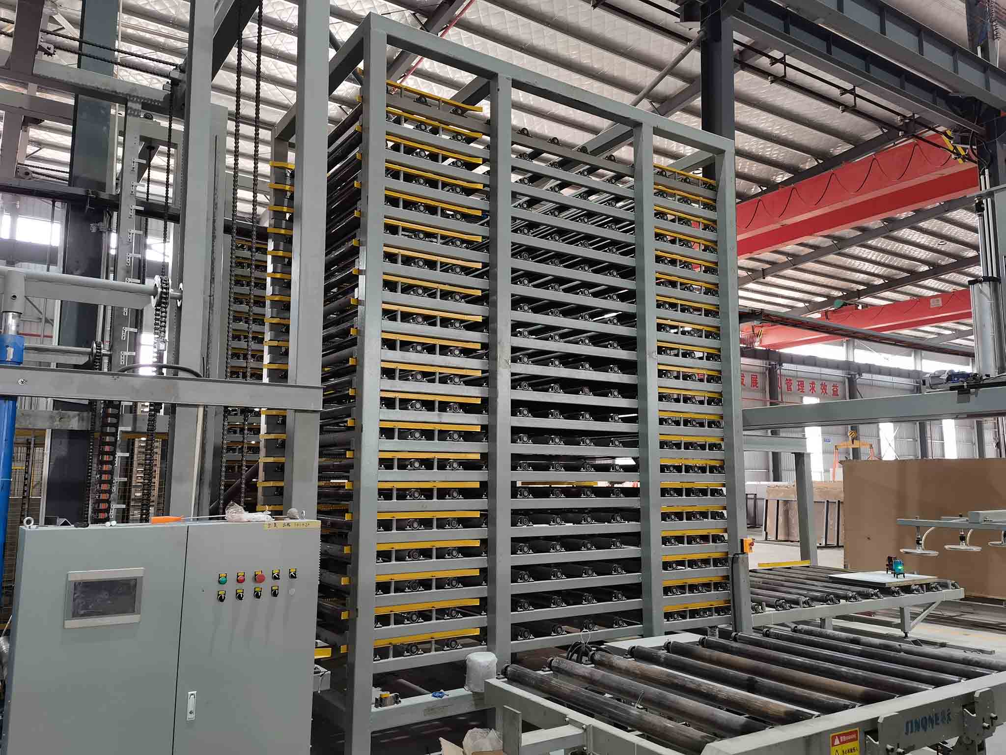 Hot slabs are transferred into the vertical cooling box and placed on rollers with controlled spacing. Through natural airflow and stable positioning, slabs gradually cool to ambient temperature, preparing them for polishing or finishing processes.